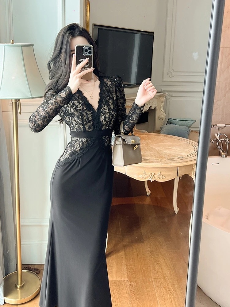 2024秋冬新品 ロングワンピース 大人 レース タイト vネック ワンピース パーティードレス キャバ 着痩せ 大人 同窓会 披露宴 卒業式 結婚式 演奏会 ウェディング 二次会 発30%までに制限