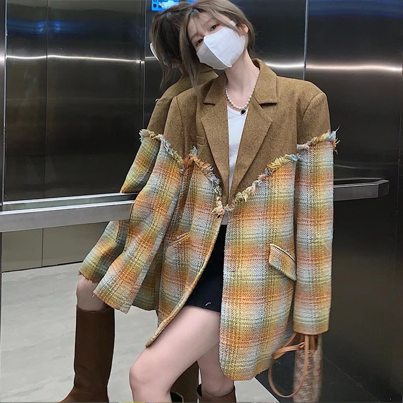 チェック柄 パッチワークジャケット チェック柄ジャケット フリンジ ジャケット スーツ襟 レディース ウールステッチスーツ アメカジコーデ オルチャンコーデ おしゃれ a3897