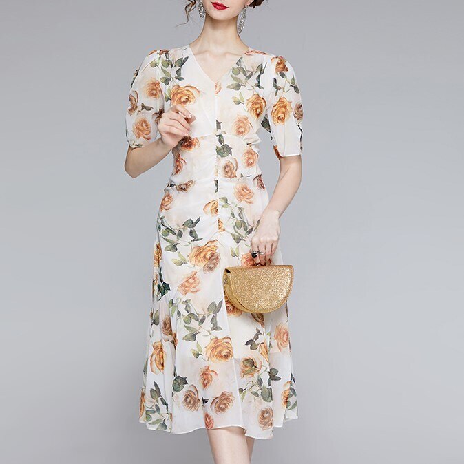 ワンピース 半袖 春 夏 秋 きれいめ Aライン フレアワンピース マーメイド フレアスカート 膝下 ミモレ丈 ミディアム丈 パフスリーブ Vネック 襟なし 透け感 春カラー アプリコット S M L