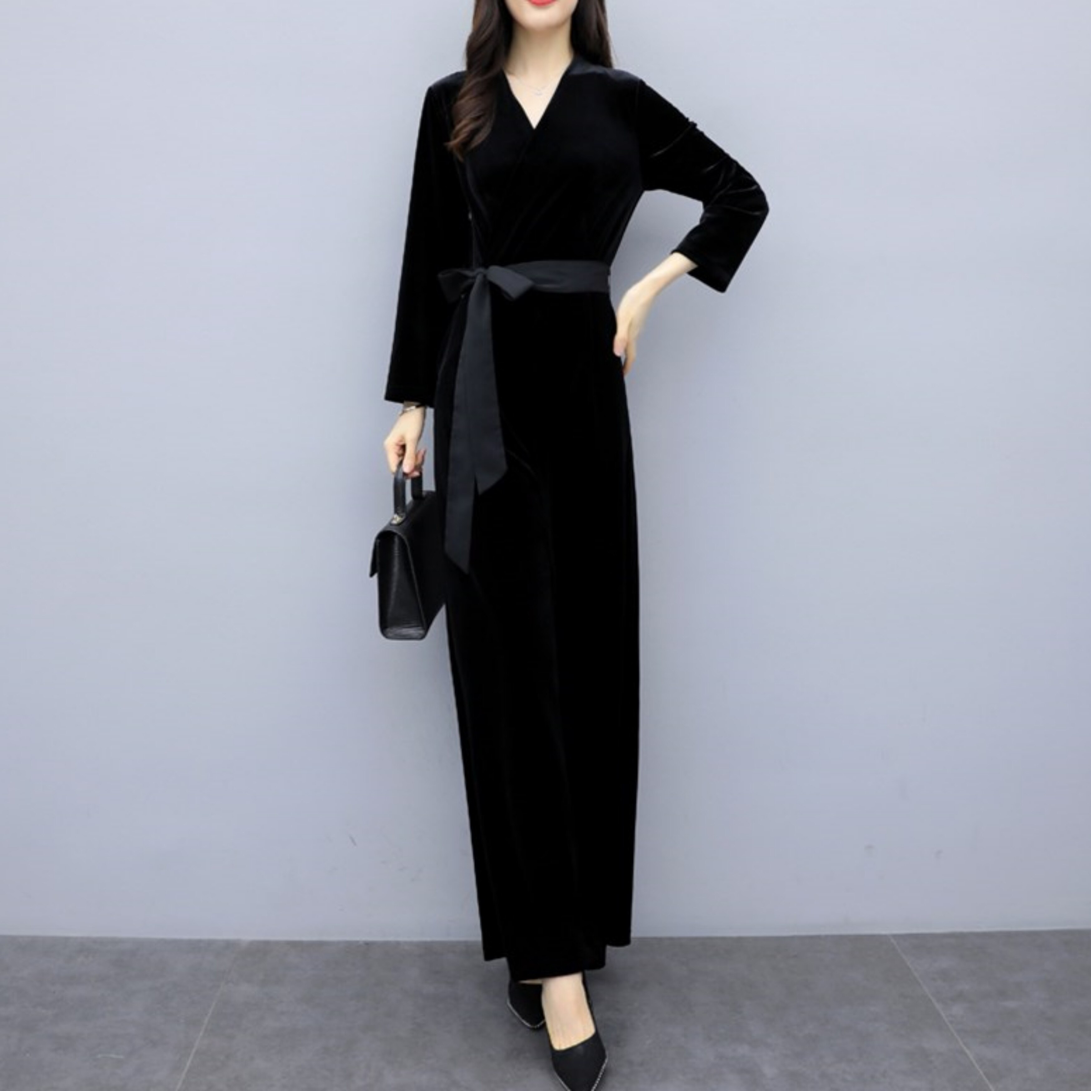 オールインワン ワイドパンツ ワンピドレス パンツ ワンピース ドレス ロング ロング丈 袖あり 長袖 Vネック ウエストリボン付き スリム美人 大人かっこいい 脚長効果 パーティー 食事会 女子