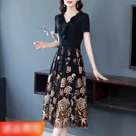 ワンピース ミモレ ミモレ丈 ロング ロング丈 袖あり 半袖 Vネック Aライン 刺繍 シフォン フリル 快適 着心地 きれいめ 大人 上品 おしゃれ お洒落 かっこいい レトロ 大人女子 こなれ感