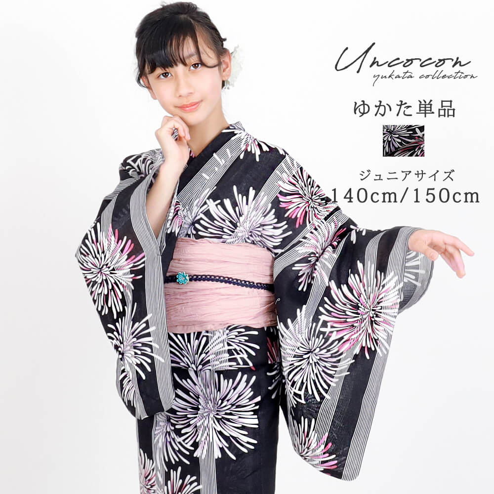子供浴衣 単品 ジュニア ジュニア浴衣 子供 浴衣 女の子浴衣 140 150 160 レトロ お洒落 花火 黒 紫 ピンク