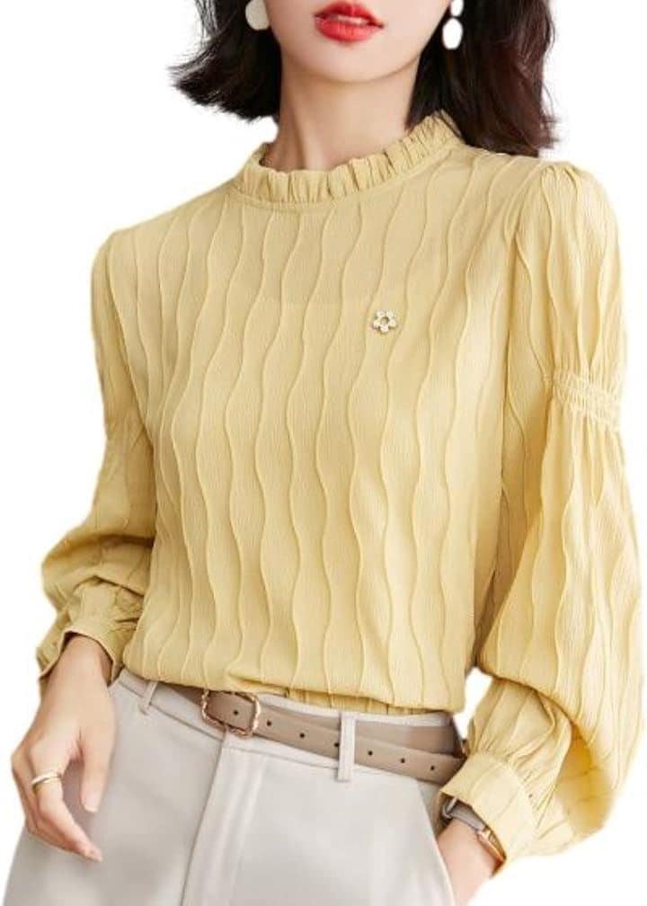 レディース シャツ ブラウス 長袖 ボリューム袖 Uネック ラウンドネック フレア Aライン フェミニン ストリート フリル かわいい 大人可愛い きれいめ シンプル カジュアル おしゃれ レトロ