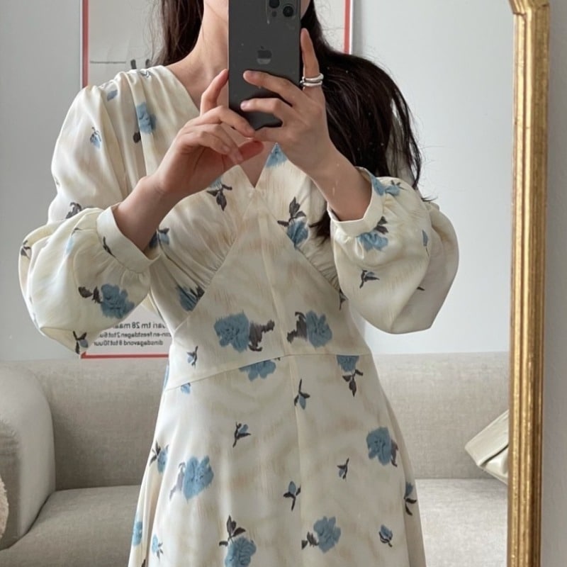 3色 ワンピース 長袖 春 秋 きれいめ ロング aライン Aライン フレア ミモレ丈 ロング丈 Vネック 深 Vネック カシュクール フレア スリム 細身 ハイウエスト 青 ブルー 黄色 イエロー